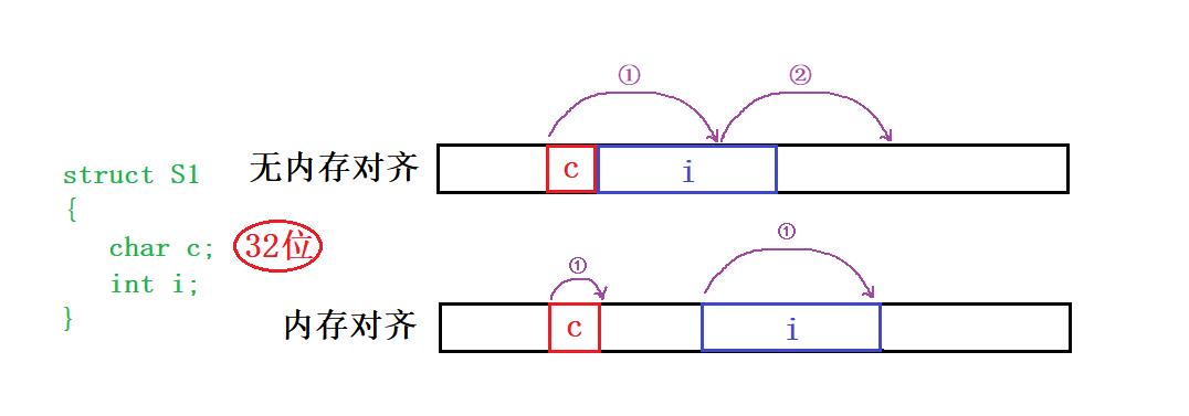 c和i,然后要在内存中存储它们,我分为了两种,一个是【无内存对齐】,呈现的是紧密存放;一个是【内存对齐】,需要考虑到最大对齐数 - 然后在32位平台下去分别访问结构体中的成员,假设现在读取数据的时候一次性读四个字节。
