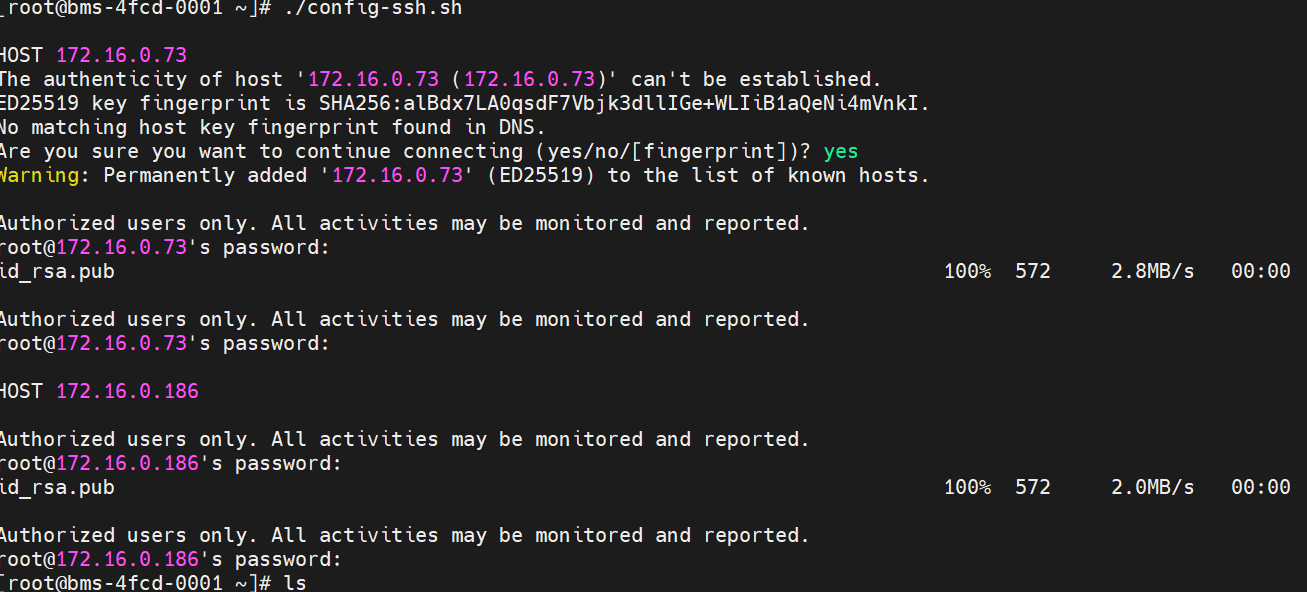 在执行时,会需要在信任节点输入其他节点的ssh密码,来将信任节点的rsa公钥发给其他节点,并写入authorized_keys文件。如下图,需要输入server1和server2的密码。