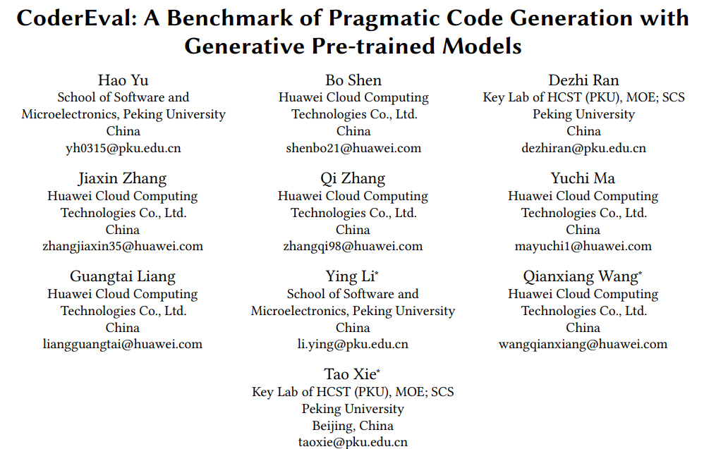本文主要介绍了一个名为CoderEval的代码生成大模型评估基准,并对三个代码生成模型(CodeGen、PanGu-Coder和ChatGPT)在该基准上的表现进行了评估和比较。研究人员从真实的开源项目中的选取了代码生成任务来构建CoderEval,并根据对外部依赖的程度为标准将这些任务分为6个等级、根据生成的目标分为3类生成任务,以更多维地评估不同大模型在不同上下文场景中的生成效果。实验结果表明,这三个模型在生成自包含函数方面的效果明显优于其他任务,但实际项目中的函数大部分依赖不同程度的上下文信息,因此提高模型对上下文信息的考虑和利用能力对于代码生成技术的实际可用性非常重要。该工作由北京大学和华为云Paas技术创新LAB合作完成,论文已经被软件工程顶会ICSE 2024录用。
