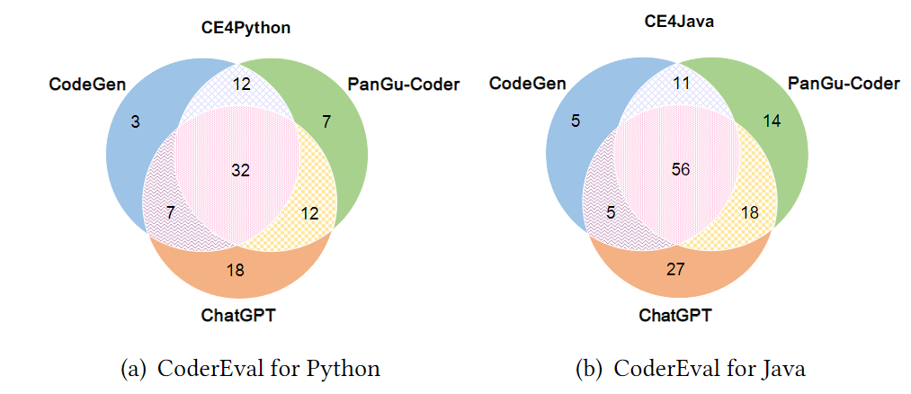 3. 如图2所示,在CoderEval上,三个模型正确生成的任务存在较大的交集(Python:32,Java:56),说明三个模型在解决部分任务上有共性能力;同时,对于仅有一个模型能正确生成、而其他两个模型未正确生成的任务而言,ChatGPT在Python和Java上都是最多的(Python:18,Java:27),说明ChatGPT在解决这部分任务上的能力具有显著优势;最后,三个模型一共解决的任务数仍仅占CoderEval所有任务数的约40%(Python:91/230)和59%(Java:136/230),说明三个模型的能力具有一定的互补性,且各自仍有较大提升空间。