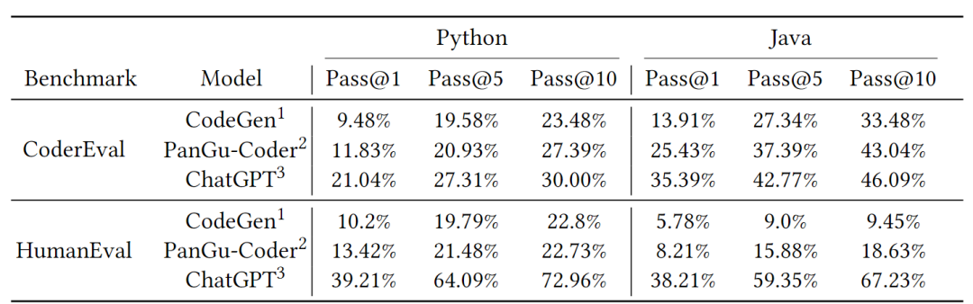 1. 如表1所示,在CoderEval和HumanEval上,ChatGPT的效果都大幅超出其他两个模型,原因可能来自于更大的模型规模、更充分的训练度、更优的超参数等方面。