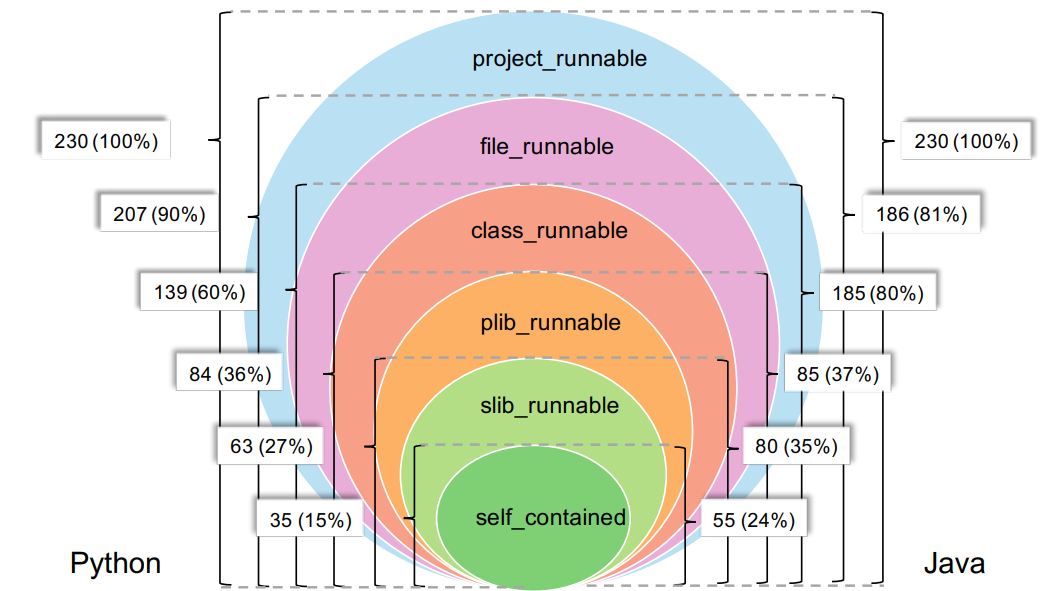 2. 分级评估:如图1所示,依据所依赖的上下文信息,CoderEval进一步将生成任务分成了6个级别(self_contained、slib_runnable、plib_runnable、class_runnable、project_runnable),代表所对应代码可执行的环境(标准库、第三方库、当前文件、当前项目等)。CoderEval支持更细粒度地测试和分析模型在每个级别上的生成能力,从而可以全面地分析当前模型的不足和待优化的方向(如引入课程学习、针对性微调、上下文可感知度的针对性提升等)。