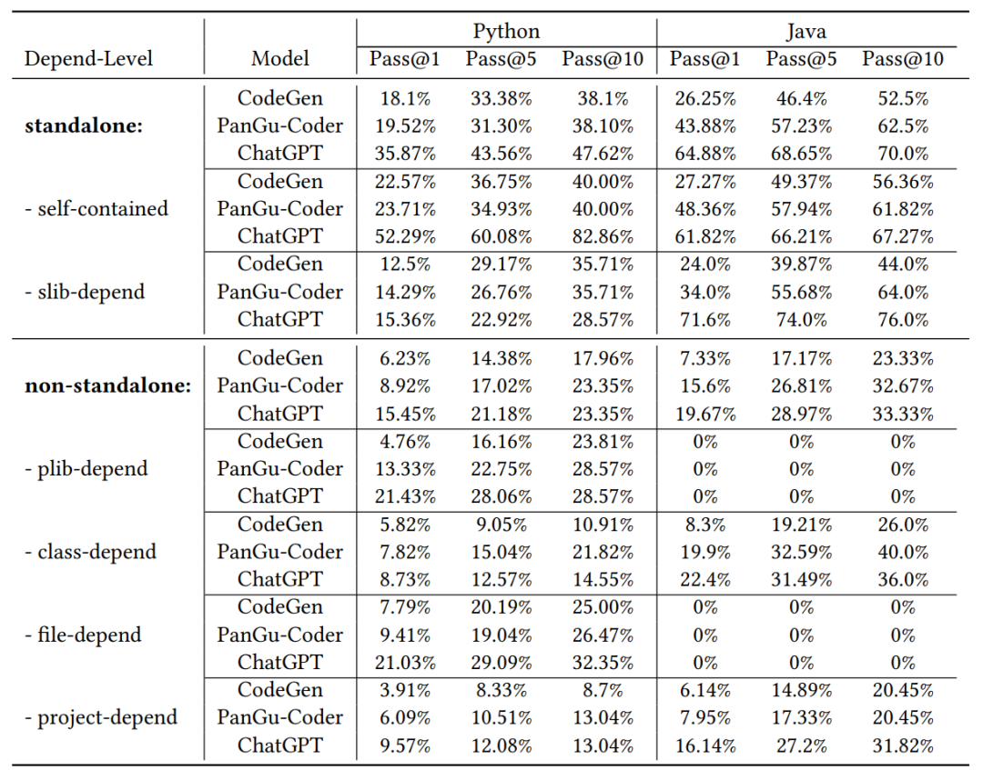 4. 如表2所示,在CoderEval的standalone子集上,三个模型的表现与HumanEval上基本接近,ChatGPT的表现大幅超过另外两个模型;但是,在其他依赖于上下文信息的生成任务上(占实际情况的60%以上),三个模型的表现都有较大下降,即使是最强大的ChatGPT的表现也有很大波动,甚至在部分级别上三个模型生成10次的结果均错误,这一定程度上说明了依赖上下文的代码生成任务是大模型代码生成下一步优化的重点方向。