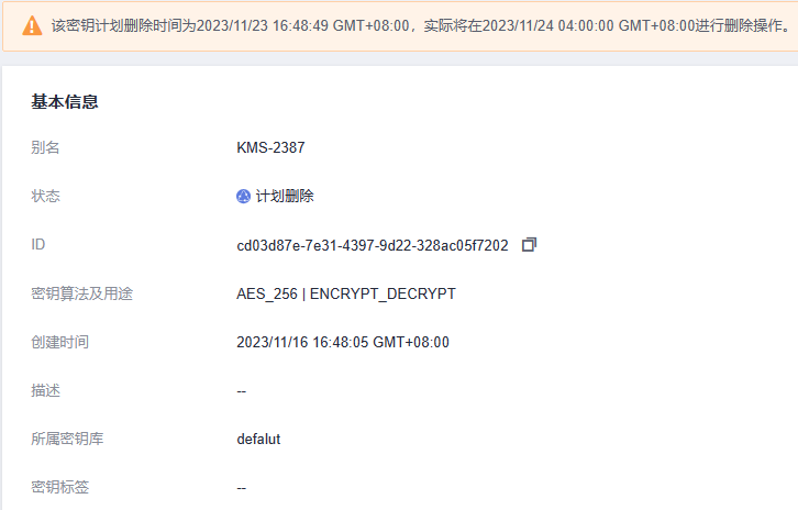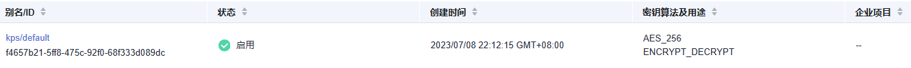 默认密钥:在用户第一次通过对应云服务使用KMS加密时,云服务自动通过密钥管理为用户创建的密钥,其别名后缀为“/default”。