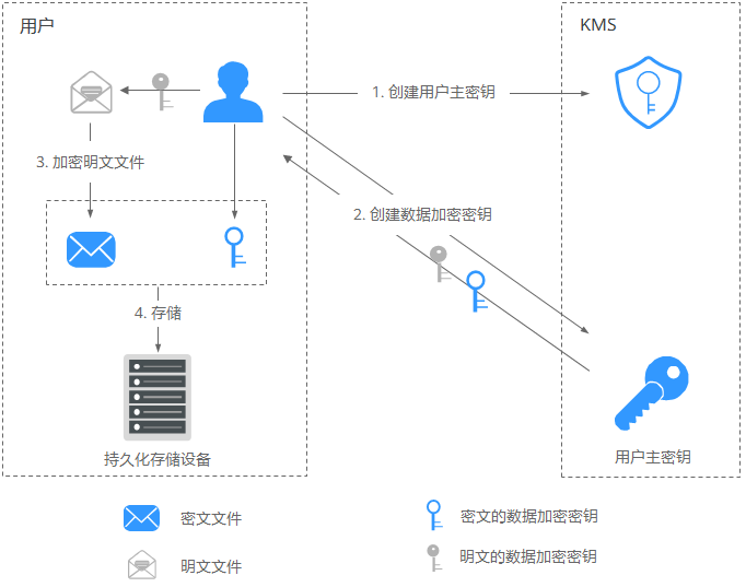 信封加密:将加密数据的数据密钥封入信封中存储、传递和使用,不再使用用户主密钥直接加解密数据。