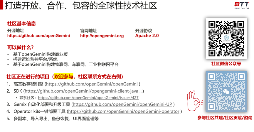 openGemini社区旨在打造开放、合作、包容的全球性技术社区,社区正在快速发展中,接下来会聚焦于开发更多功能,对性能进行调优。社区尚有理想未达,在此诚邀大家参与openGemini的建设(不限于代码、文档、生态贡献),同社区一起成长,彼此携手方能到达远方。