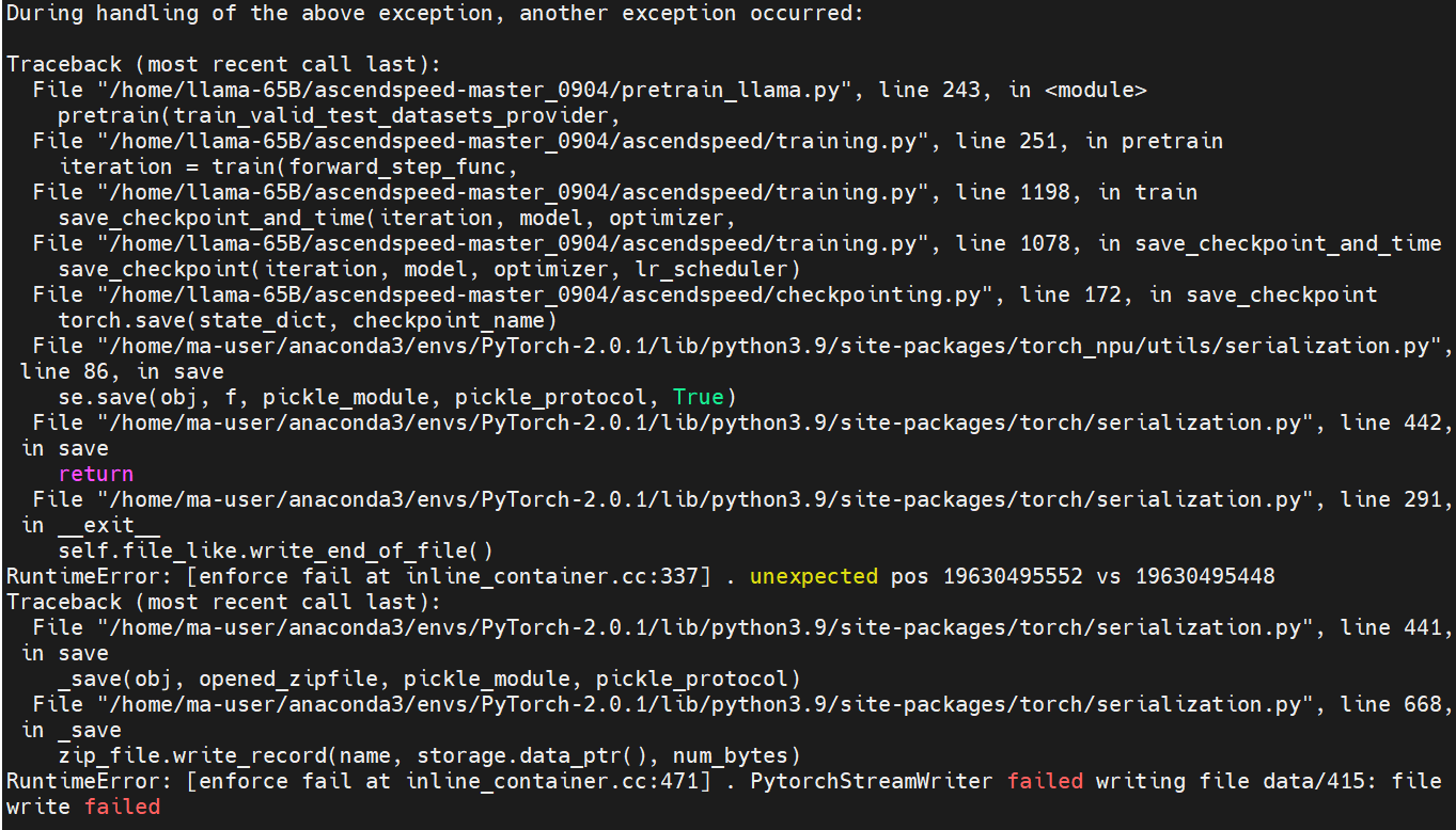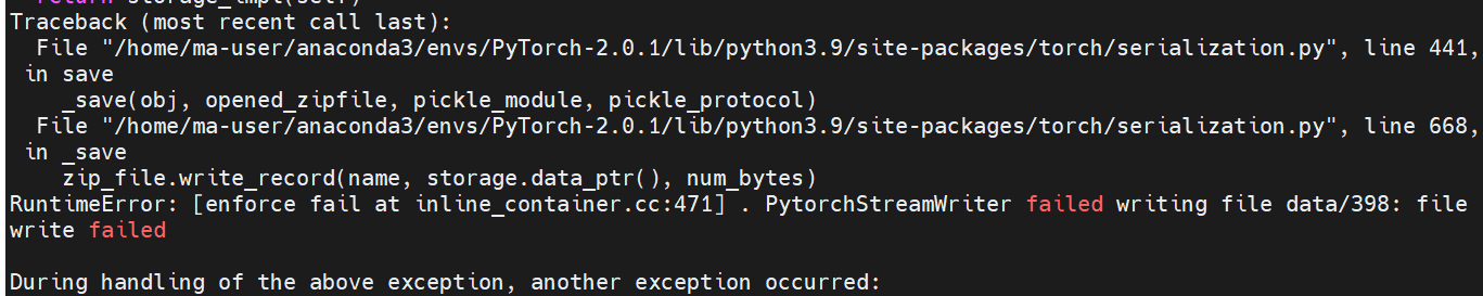 【摘要】 1. 问题描述使用华为云昇腾Snt9B裸金属服务器,基于pytorch框架进行大模型训练时,需要迭代训练100轮,在第21轮训练时中途报错:RuntimeError: [enforce fail at inline_container.cc:471] . PytorchStreamWriter failed writing file data: file write failed具体报错信息...