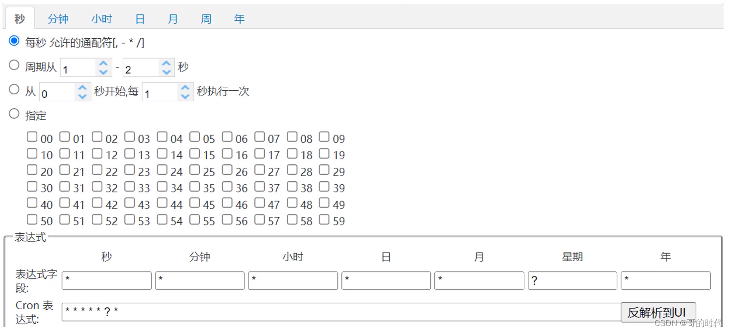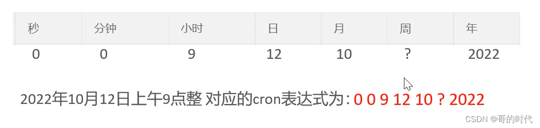 每个域的含义分别为:秒、分钟、小时、日、月、周、年(可选)