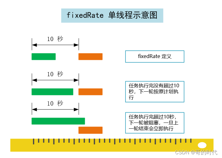 这个相对难以理解一些。在理想情况下,下一次开始和上一次开始之间的时间间隔是一定的。但是默认情况下 Spring Boot 定时任务是单线程执行的。当下一轮的任务满足时间策略后任务就会加入队列,也就是说当本次任务开始执行时下一次任务的时间就已经确定了,由于本次任务的“超时”执行,下一次任务的等待时间就会被压缩甚至阻塞,看图就明白了。