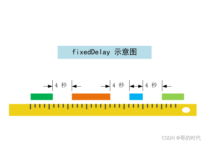 它的间隔时间是根据上次的任务结束的时候开始计时的,只要盯紧上一次执行结束的时间即可,跟任务逻辑的执行时间无关,两个轮次的间隔距离是固定的。