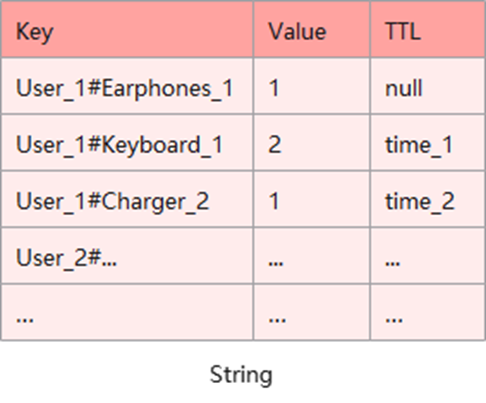 如图所示基于String可以轻松地实现各个用户的购物车功能,该方案需要将用户ID与商品ID进行拼接作为key,例如User_1#Earphones_1,key对应的value为购物车中用户准备购买的数量,其中可能有部分商品为限时特购,所以有过期时间,为key对应的过期时间。