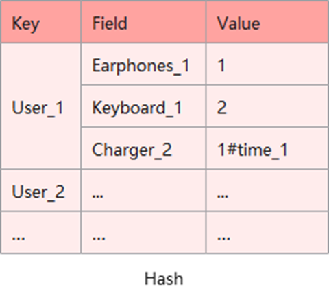 可以根据如图所示的Hash类型来实现购物车的管理,用户ID作为key,商品ID作为field,value为购物车中对应商品的数量。其中对于部分限时特购的商品,其过期时间通过拼接的方式放到field对应的value里。