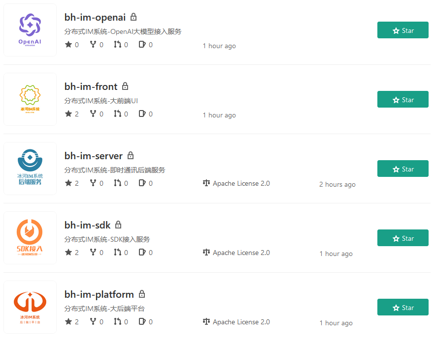 这次咱们启动的分布式IM即时通讯系统,首先,从项目的名称上就可以看出来,它是支持分布式的,可以在线上环境无限扩展,并且考虑到真实环境下即时通讯的需求,冰河会将整个分布式IM即时通讯系统分为五大部分:即时通讯后端服务、大后端平台、SDK接入服务、OpenAI接入服务、大前端UI。