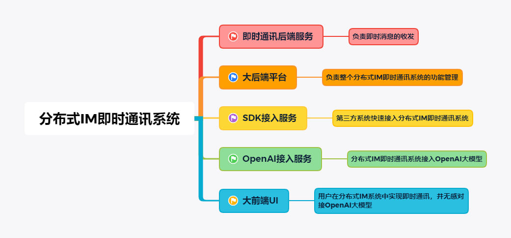 分布式IM即时通讯系统不同于其他项目,在大纲层面与其他系统有所区别,总体上暂时会分成如下几部分(可能会随着系统的不断完善有所调整):需求设计、后端服务、SDK接入服务、大后端平台、OpenAI大模型接入服务、大前端UI、部署与监控等几部分。