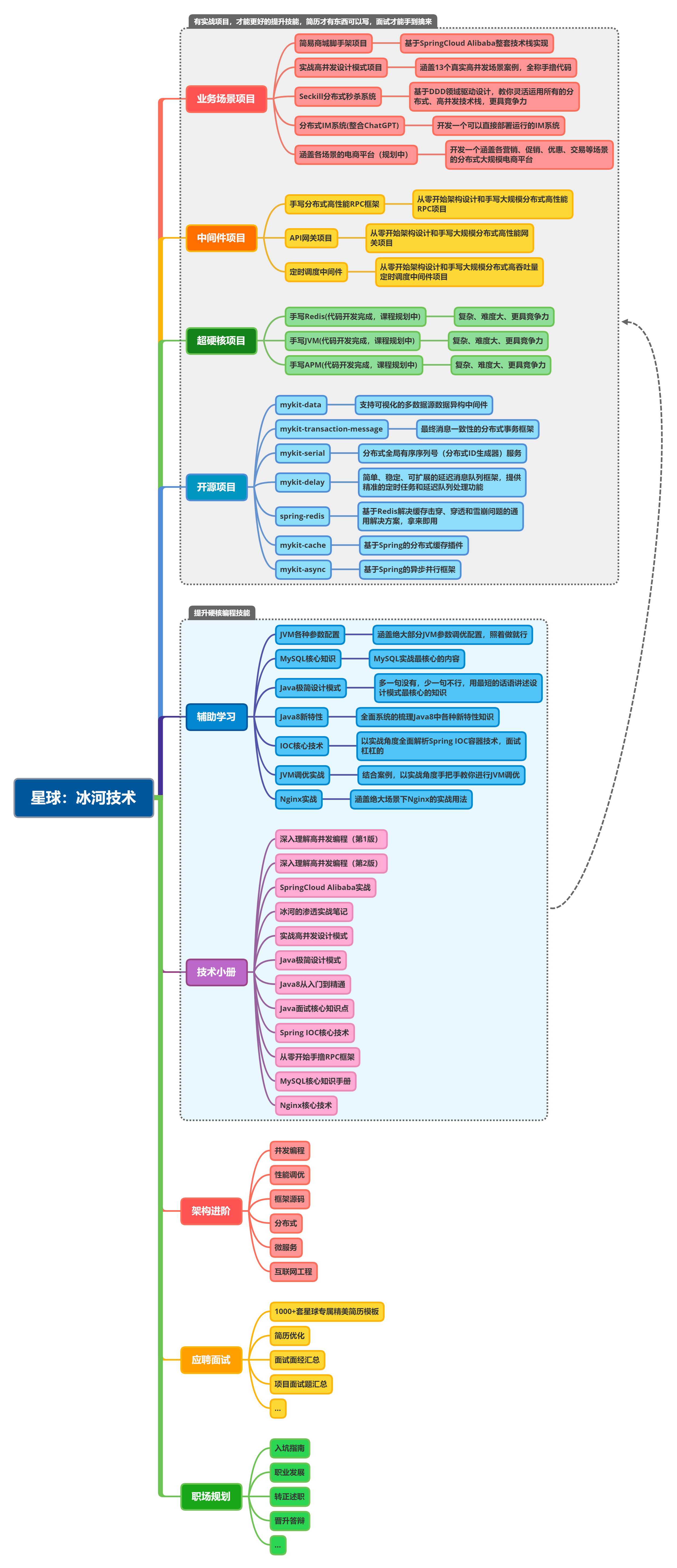 分布式IM即时通讯系统是冰河技术知识星球诸多项目中的其中一个,还有很多其他项目,例如:简易商城脚手架项目、Seckill秒杀系统、高并发设计模式等等,还有开源项目、技术小册、1000+精美简历模板与面试技巧等(加入星球后直戳链接:https://t.zsxq.com/140wNNbz9)。详情可以点击放大下图进行查看。