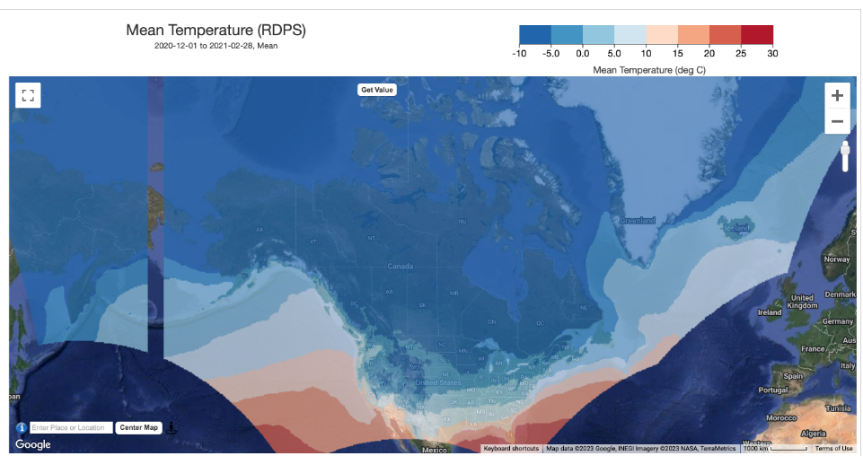 描述: 区域确定性预测系统 (RDPS) 进行物理计算,以获得从当天到未来 48 小时的大气元素的确定性预测。平均温度数据覆盖北美,由加拿大气象局 (MSC) 提供,该部门隶属于加拿大环境与气候变化部 (ECCC)。MSC 全年 365 天、每天 24 小时提供天气预报和警报。MSC 还向联邦部门、机构和其他各级政府提供信息,以支持应急准备和应对风暴、洪水、野火和其他与天气相关的紧急情况等事件。