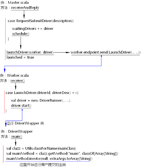 当提交任务之后,客户端向Master申请启动Driver,这里首先会启动一个DriverWrapper类来对用户提交的application进行包装运行,DriverWrapper类的启动过程如下: