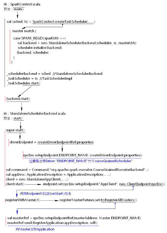 当执行用户的代码时,在new SparkContext时,会注册真正的Driver 角色,这个角色名称为“CoarseGrainedScheduler”,Driver角色注册之后,注册“AppClient”角色,由当前这个角色向Master注册Application。代码流程如下: