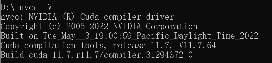 打开命令行工具,输入nvcc -V查看cuda是否成功,当出现以下信息时表示CUDA安装成功。