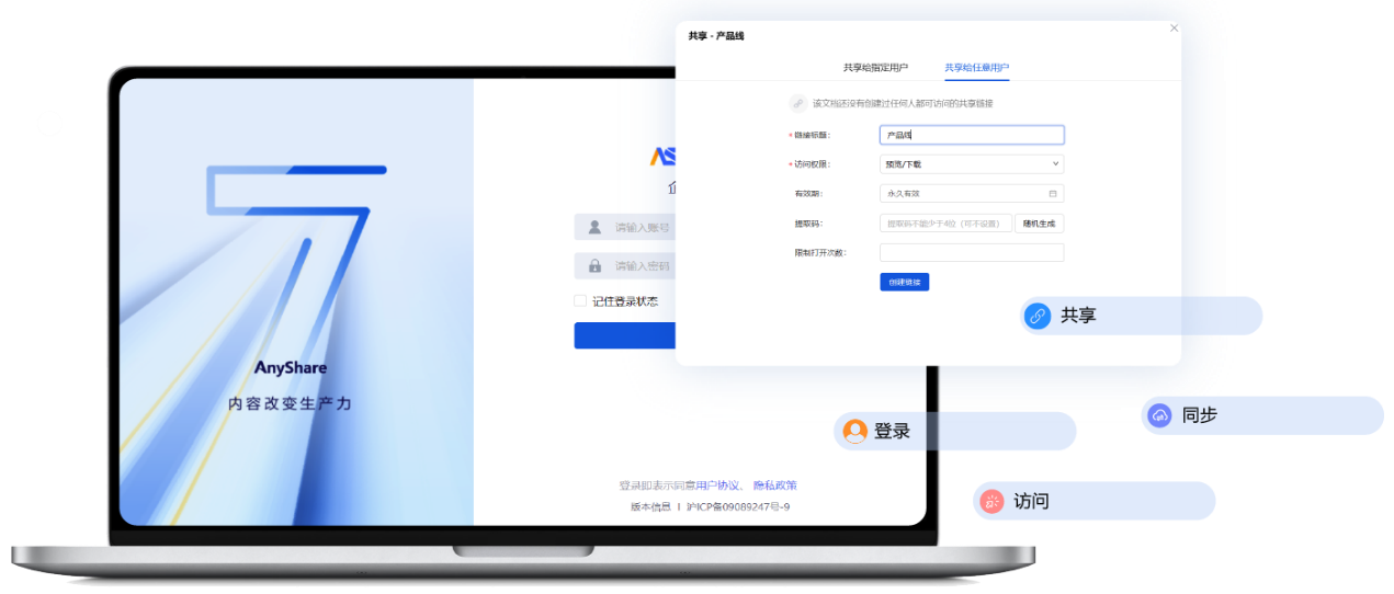 基于华为云严格标准的安全运维体系,AnyShare 专属内容云可帮助企业构建平台层+应用层+数据层的立体安全防护,单租户SaaS模式“上不碰应用,下不碰数据”,实现应用与数据隔离,确保数据安全与合规。此外AnyShare本身丰富灵活的安全策略可实现事前预防、事中保护与事后追溯,支持用户自行配置权限,满足多维的安全合规需求。