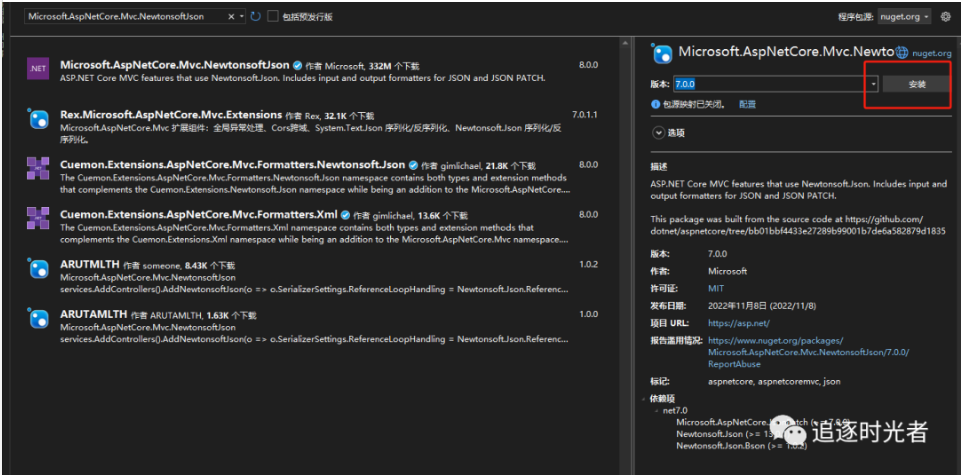 在.NET 3.0及其以上的版本使用Newtonsoft.Json需要通过安装 Microsoft.AspNetCore.Mvc.NewtonsoftJson 包来进行配置(注意假如提示该包安装失败可以尝试安装其他版本的包)。
