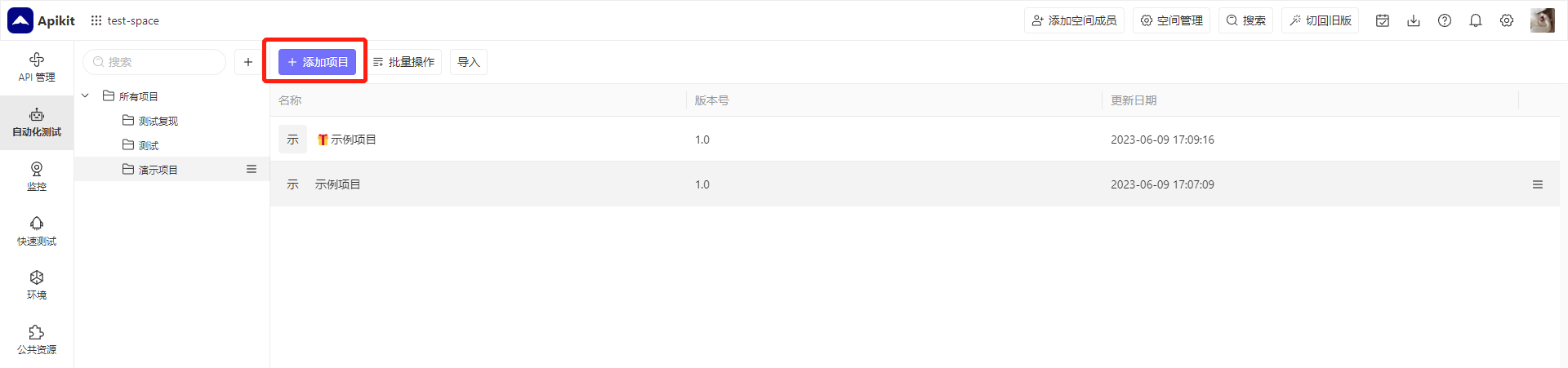 点击左侧菜单栏,进入 API自动化测试 项目列表页,点击添加按钮: