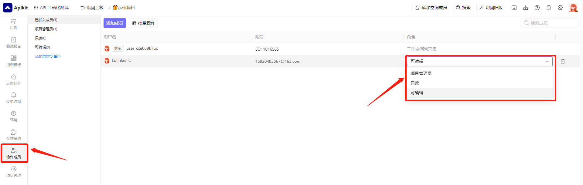 在创建项目时,您也可以指定一位空间内的成员成为该项目的初始管理员,他能够帮助您进行项目内的人员权限管理工作,如绑定空间内的成员到该项目,或者修改某个成员的操作权限等。