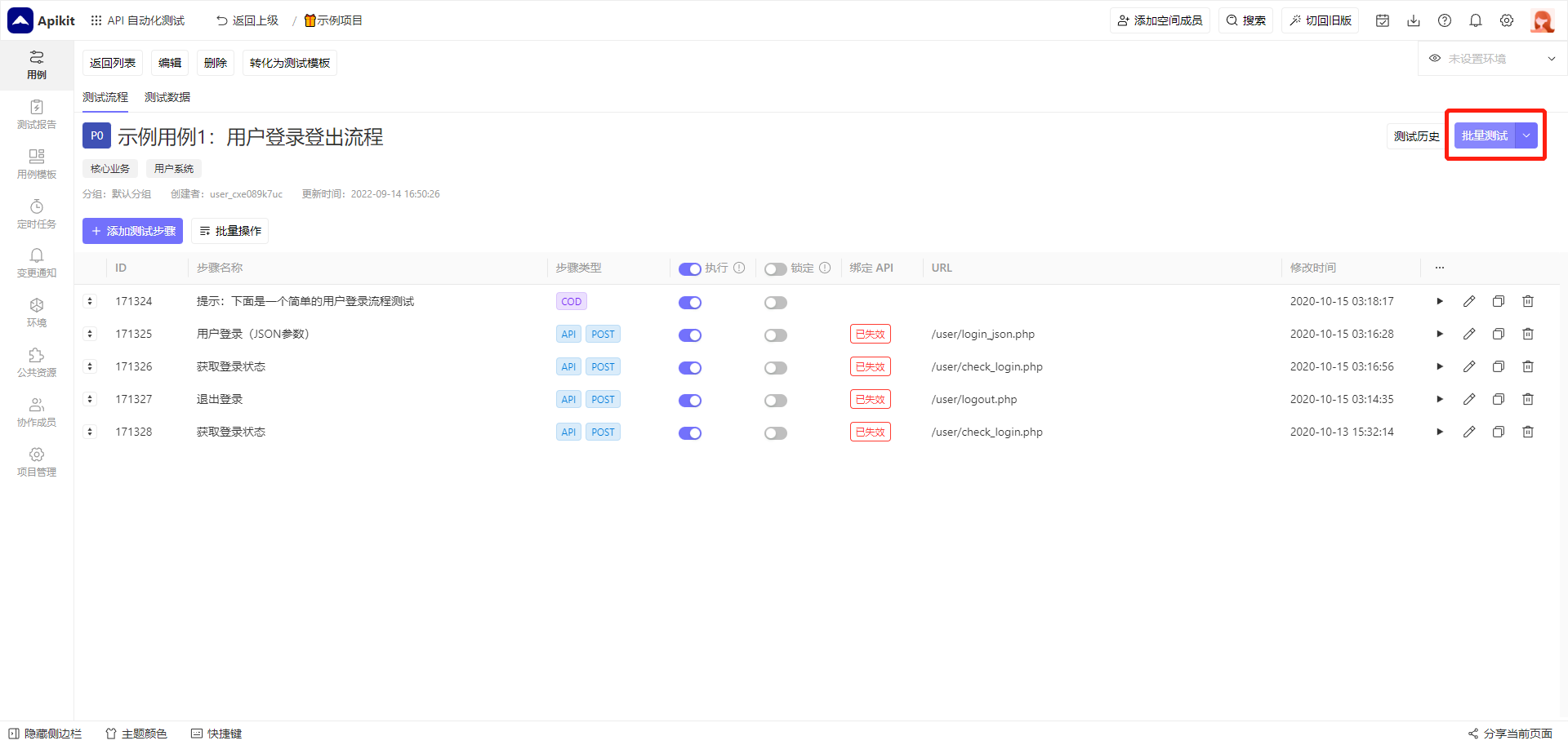 创建好测试用例之后,点击 执行测试 按钮即可运行测试,系统会自动按顺序执行测试流程里的每个测试步骤并且得到详细的测试报告。