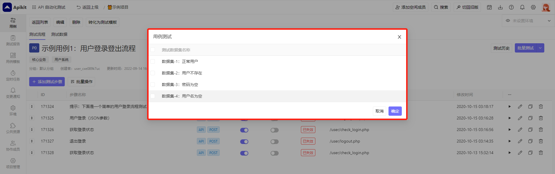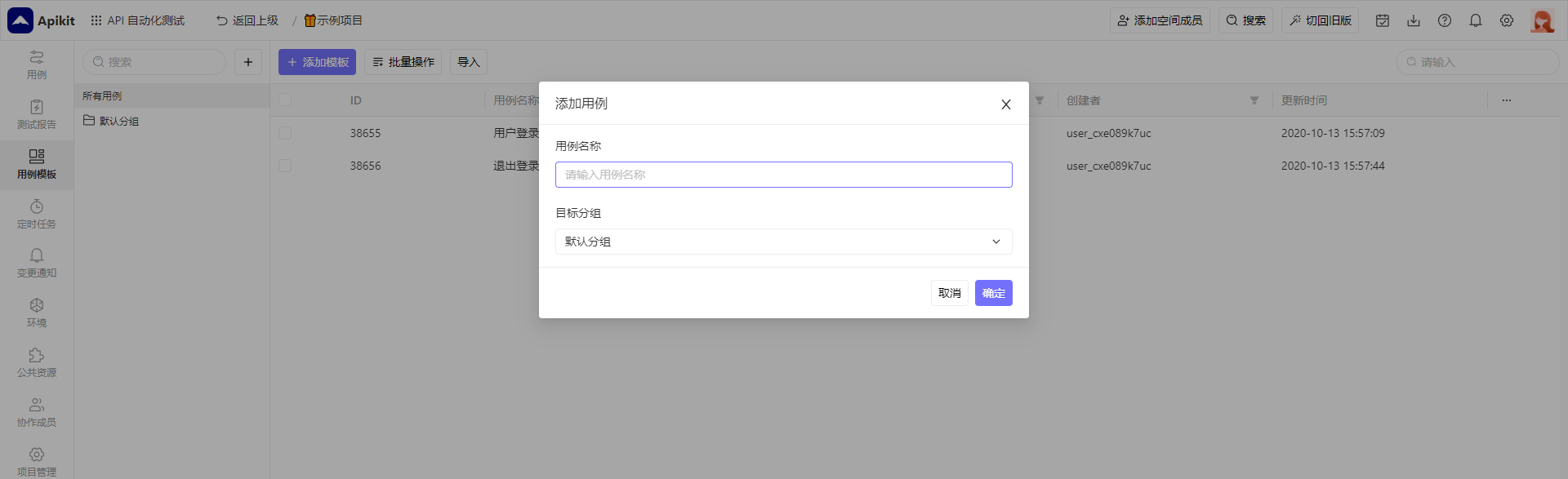 进入自动化测试用例管理页面,点击 添加用例 按钮,在弹窗中输入用例名称等信息,然后点击确定即可。