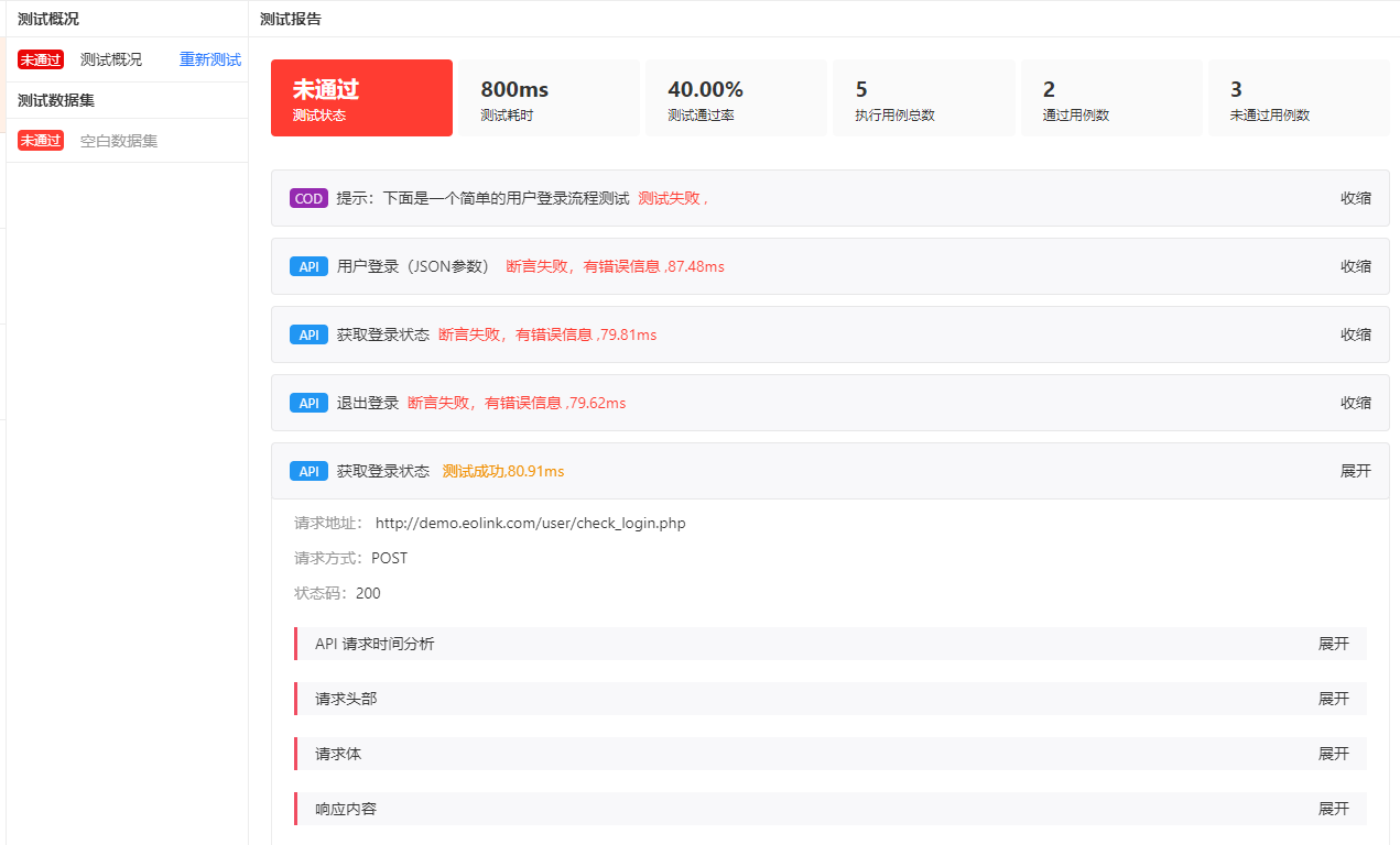 如下图是执行测试后的报告效果,您可以看到每个数据集、每个测试步骤的测试结果,结果中包括详细的请求时间、请求参数、返回结果等内容。