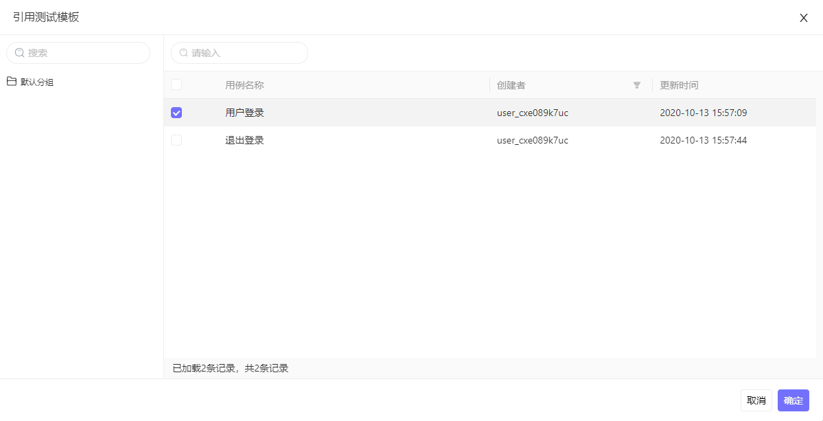 测试模板的创建和测试方式与普通的测试用例一致,当您创建好测试模板之后,可以在流程测试用例页面,点击引用测试模板按钮,在弹窗中选择需要引入的测试模板即可: