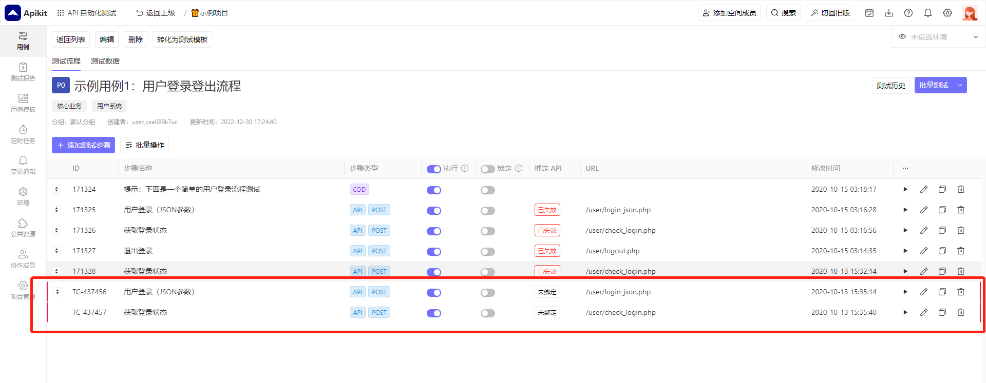 在API 自动化测试中,所有的测试用例都是以项目维度来进行管理,一个自动化测试项目可以从多个API文档项目中引用API信息来创建API测试用例。