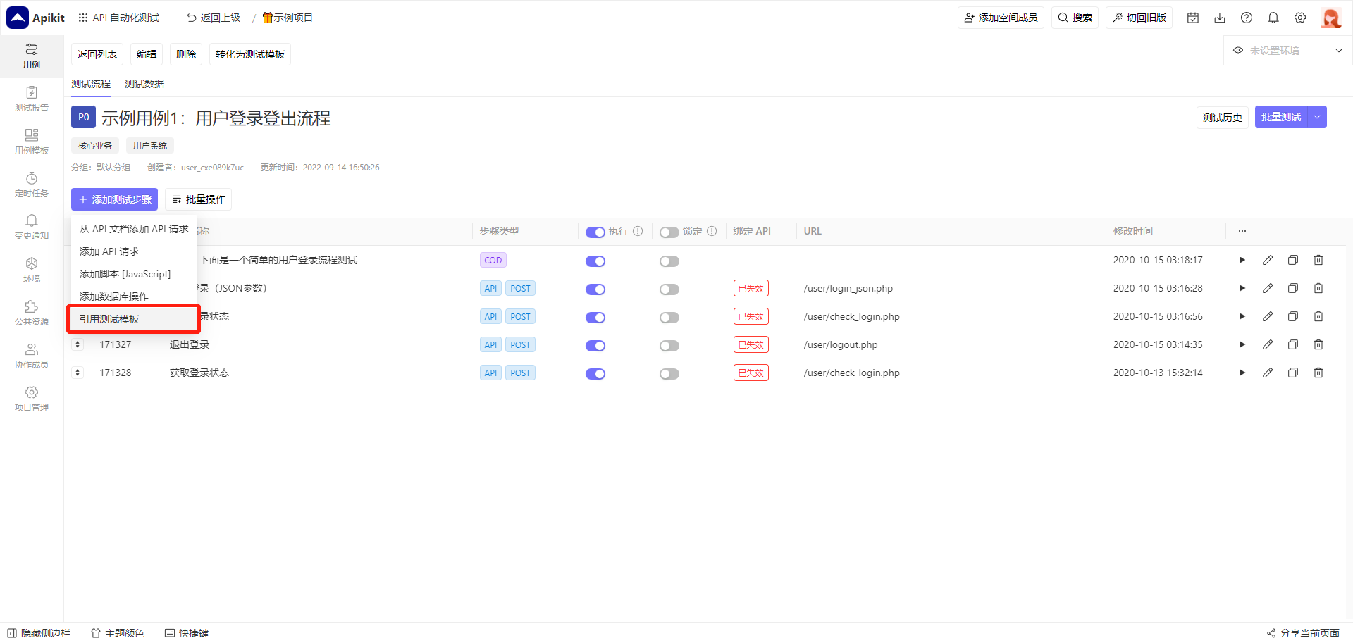 可以将某个测试用例转换为测试模板,测试模板可以被其他测试用例引用,通过不断将测试用例复用来实现快速组合复杂的测试用例。