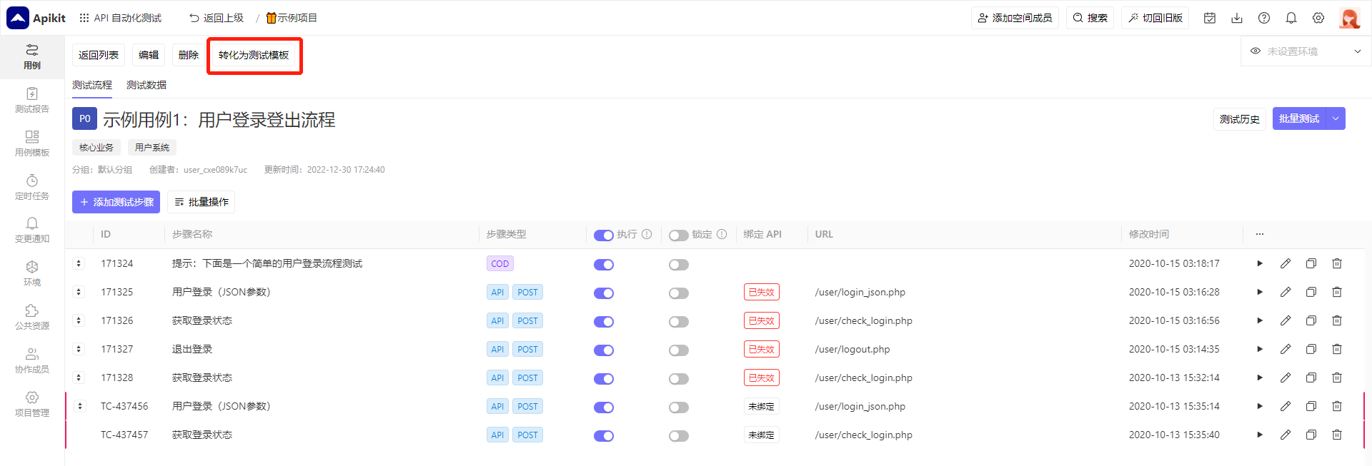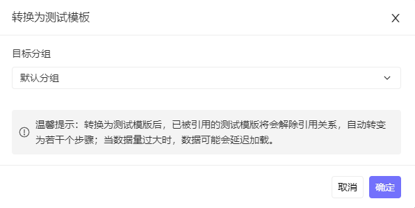 提示:转换为测试模板后,已被引用的测试模板将会解除引用关系,自动转变为若干个步骤