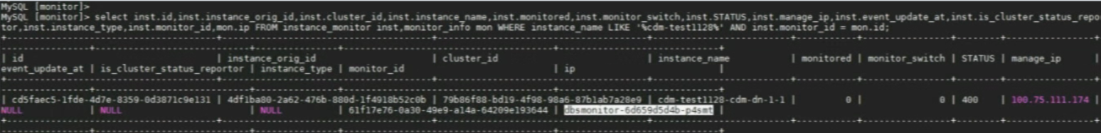 如下图查询发现实例存在且instance_type为NULL表示agent未上报状态,可能是manageIp的12017或2000端口不通;或者monitor_info表中存在不正常的monitor实例记录;