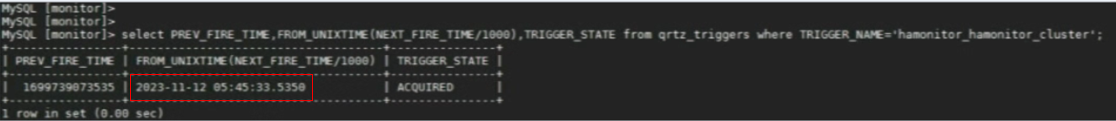 UPDATE qrtz_triggers SET NEXT_FIRE_TIME="1700034136000", TRIGGER_STATE = 'WAITING' WHERE TRIGGER_NAME = 'hamonitor_hamonitor_cluster'; 注意时间修改为当前数据库时间往后一到两分钟,等时间到就会触发定时任务。