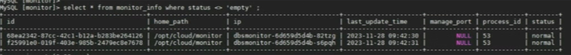 6、查询monitor_info表的记录,查看处于normal状态的monitor实例个数与管控面是否一致