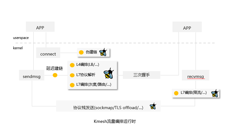 Kmesh在流量编排运行时, 基于伪建链、延迟建链等技术,OS中实现L4~L7的编排底座;基于ebpf,在内核协议栈中构筑可编程的全栈流量编排运行时。