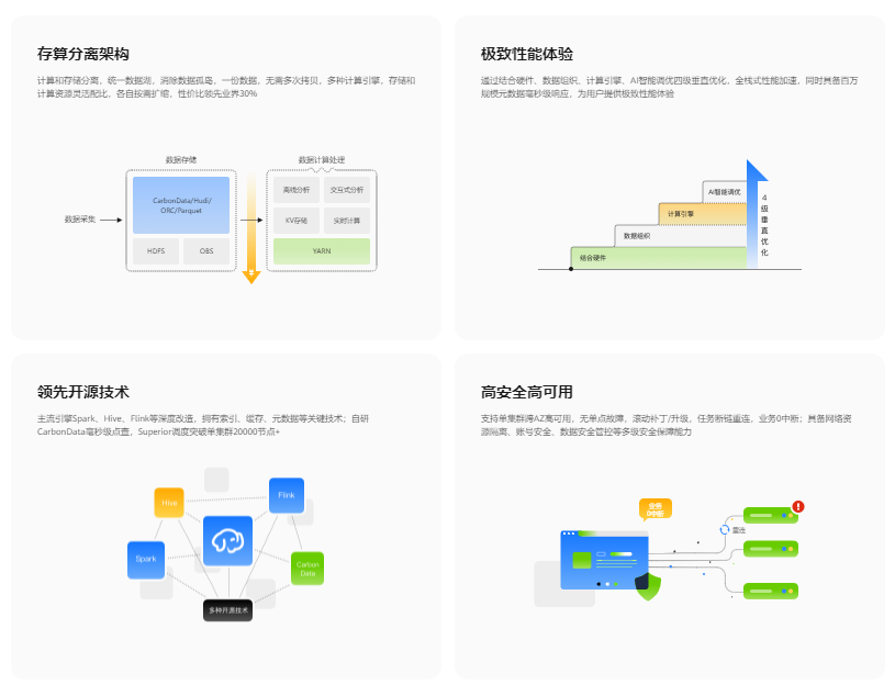 提供Hudi、Doris、Spark、HBase、Flink、Clickhouse、Hadoop等开源大数据组件,支持湖仓一体、灵活的弹性控制能力