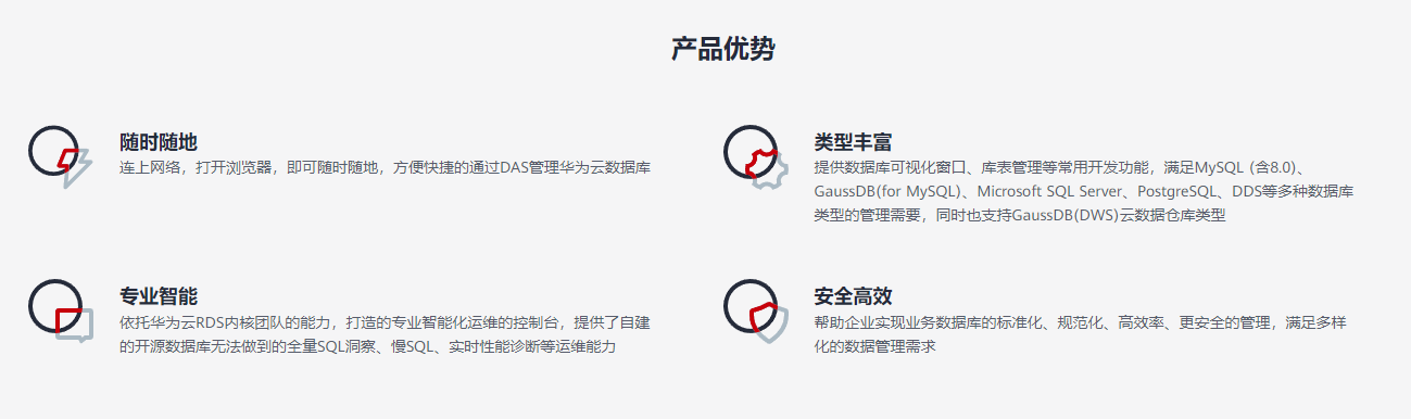 数据管理服务(Data Admin Service,简称DAS),用来登录和操作华为云上数据库的Web服务,提供数据库开发、运维、智能诊断一站式云上数据库管理平台,方便用户使用和运维华为云数据库。