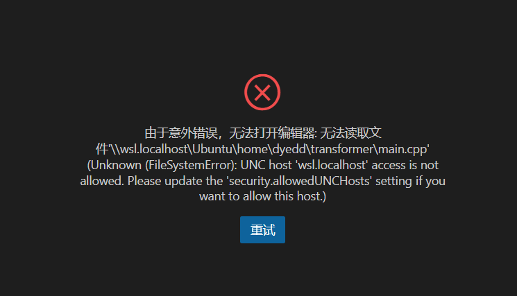 由于意外错误,无法打开编辑器: 无法读取文件’\wsl.localhost\Ubuntu\home\dyedd\main.cpp’ (Unknown (FileSystemError): UNC host ‘wsl.localhost’ access is not allowed. Please update the ‘security.allowedUNCHosts’ setting if you want to allow this host.)