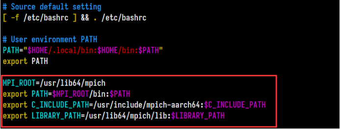 之后登录新账户,使用ssh-keygen -t rsa -b 4096指令生成本地密钥并添加公钥至所有主机。之后通过sudo yum -y install gcc-gfortran --nogpgcheck与sudo yum -y install mpich mpich-devel mpich-doc --nogpgcheck指令安装依赖包并如图配置环境变量即可。