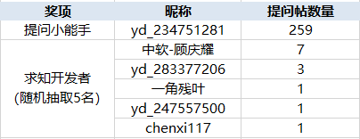 以上四个奖项当月不同时获得(提问小能手/求知开发者/积极答题王/幸运答疑奖)。