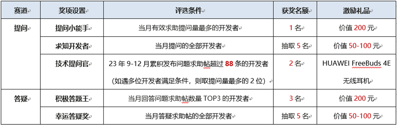 23年9-12月累积发布问题求助帖超88条的开发者可额外获得HUAWEI FreeBuds 4E无线耳机。