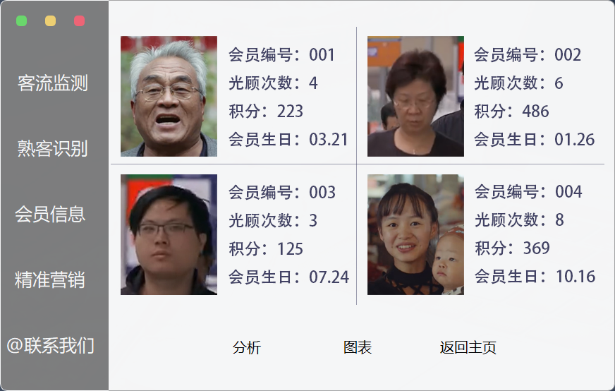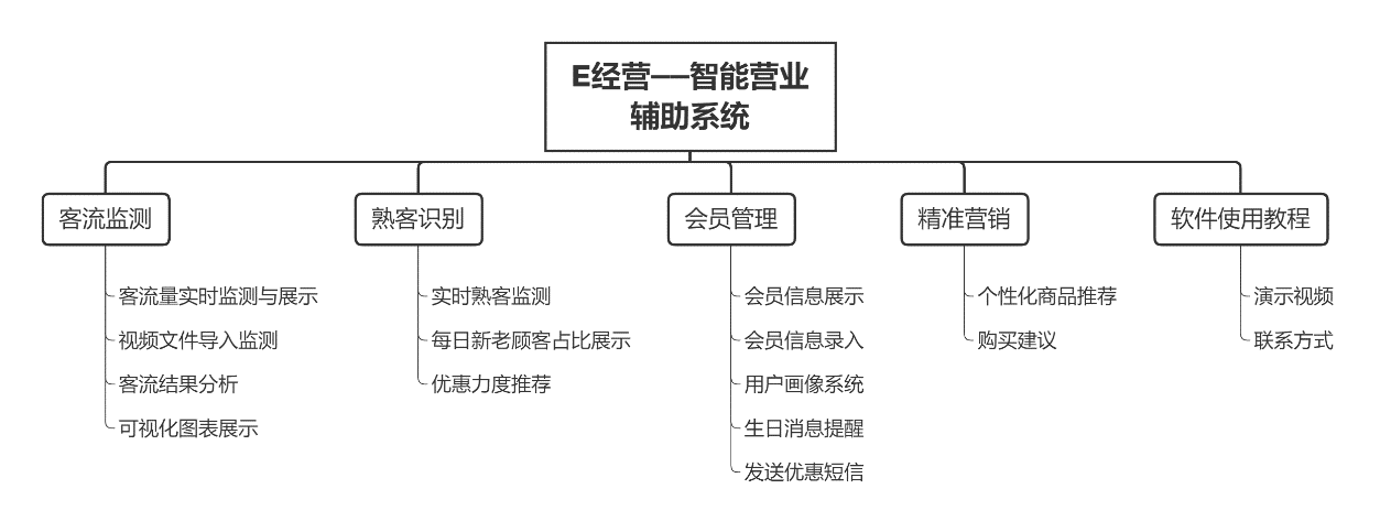 当今时代,各式店铺越来越多,顾客的购买选择不断增加,对于购买体验感的追求也越来越高,因此,为用户提供更好的服务成为当今商家考虑的一大问题。此外,随着经济的发展,员工雇佣成本不断提高,提高工作效率与减少劳动力的不必要开支也成为商家面临的重要问题。为帮助商家提升运营能力,我们设计了这款人工智能软件,使其能够实时监测店铺内客流量,以按需增减人手,并通过熟客识别功能让商家为老顾客提供更加贴心和优惠的服务,增加新顾客对商店特色的了解,与顾客建立起良好关系。而对于那些对店铺的服务质量以及盈利有更高追求的商家,我们不仅提供会员管理功能,还设置了精准营销版块。将会员基本信息与其购买商品相对应构建用户画像后,本软件可以根据用户以往购买信息对其消费行为进行多维度分析,进而为其提供个性化服务,提升商家在行业内的竞争力,也使得用户有更加优质的购物体验。我们将功能的实现分为客流量监测、熟客识别、会员信息管理和精准营销几大功能模块,对程序的设计思路进行介绍。