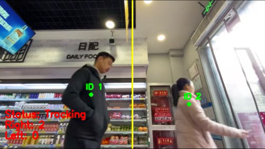 之后我们将训练好的模型部署使用,构建高计算性能的API接口,由此,我们就可以对每一帧的视频进行截取,并通过调用深度学习模型构建来实时监测人像。之后,我们使用质心算法对检测到的人像进行追踪,并根据目标轨迹判断顾客进出商店的方向,以实现对商店人数的动态统计。除此之外,我们使用OpenCV库对视频的读取,标注与刷新功能,对传入的录像或实时监控场景进行人像标注和实时进出数据在视频中的动态显示,以便商家可以在视频中看到实时数据,并以文件的形式记录这些数据。