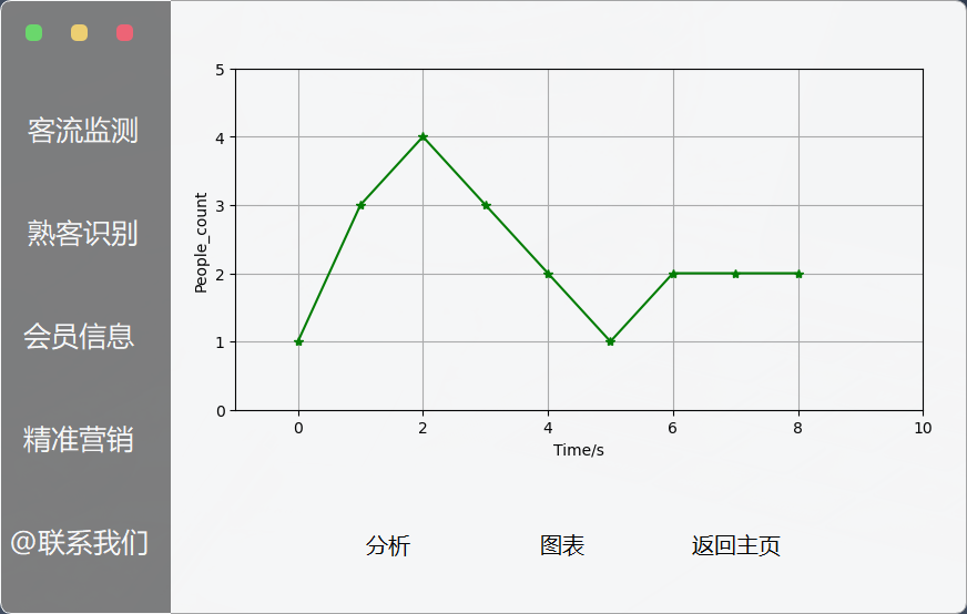 为了使用户能够直观地看到商店的有关数据,我们选择matplotlib库为用户呈现动态图表。然而在此过程中我们发现图表不仅在PyQt5的QLabel控件界面中得以呈现,还另外弹出了显示框。经过研究,我们发现这是由于matplotlib库中pause函数自动调用了show方法所致。为此,我们重新编写了pause函数,实现了可视化界面的嵌入。除此之外,我们选择在解析识别视频的同时将实时产生的数据传入图表,并每隔一秒截取图片对其进行刷新,从而直观地向用户呈现动态效果。