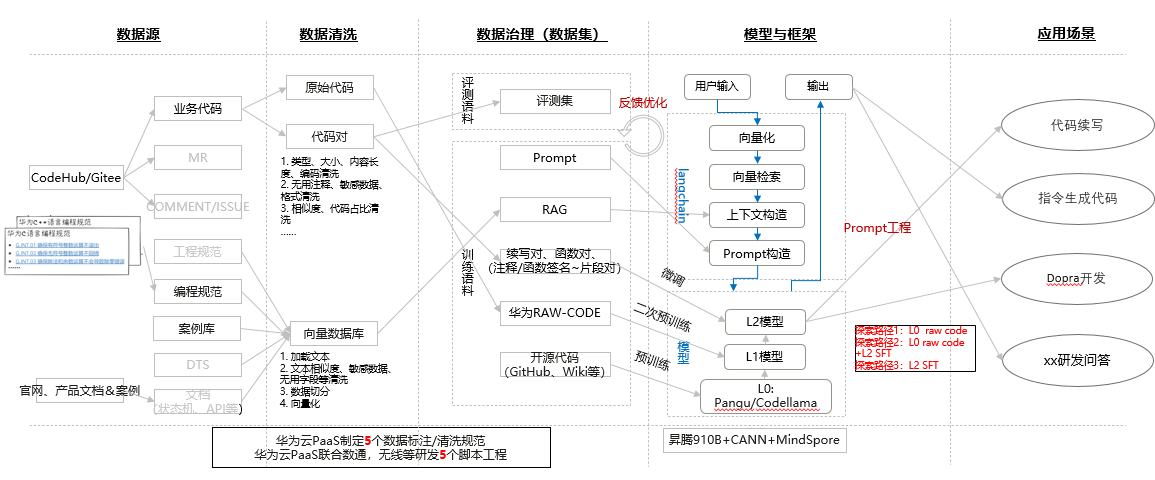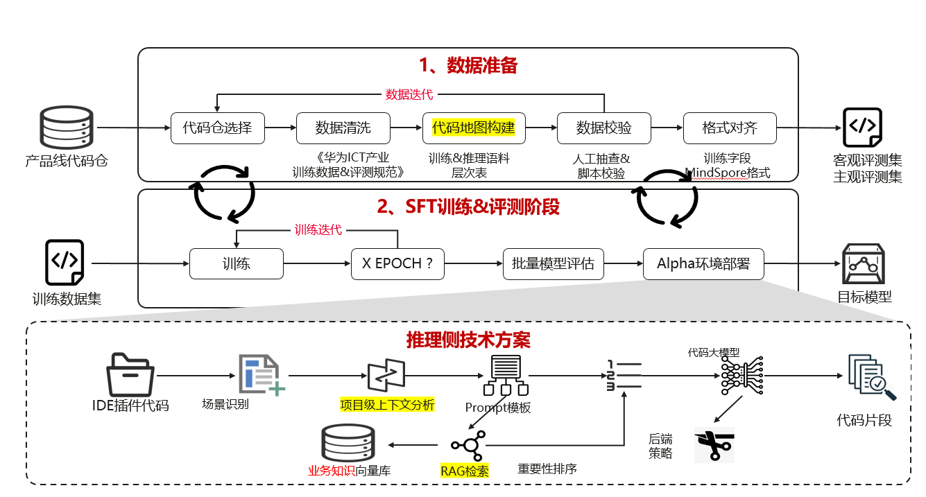 1、数据准备阶段。首先,我们对各产品线的代码仓库进行评估,挑选出高质量的代码仓库。接着,根据华为云PaaS研发项目组制定的五项数据标注和清洗规范对代码进行清洗。在《训练&推理语料层次表》的基础上,构建代码地图,并通过人工抽查与脚本校验自动化执行。最后,对训练数据进行格式统一,生成训练集、客观评测集和主观评测集。