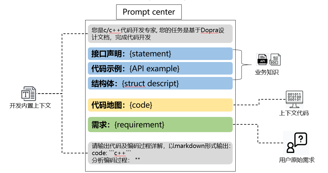 以某产品线Dopra开发场景为例,我们整理了开发手册、线下文档、社区平台以及开发者经验等数据,汇总成Dopra开发的领域知识,并将这些知识向量化,存储到向量数据库中。当用户输入需求任务后,通过RAG能力,我们可以获取与该任务相关的开发经验信息。将这些信息通过“领域经验”提示模板输入给大模型,从而显著提高大模型输出代码的正确性。