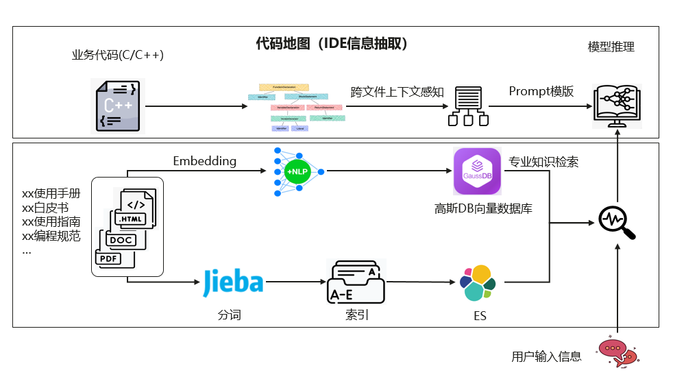 RAG(Retrieval Augmented Generation)阶段:在 IDE 项目文件中检索跨文件信息;在向量数据库中检索 API 接口说明、工程规范信息。根据 prompt 模板,将用户的需求描述与上述检索信息拼接成完整的 prompt,输入给大模型。